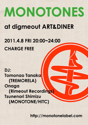 2011-03-272021-02-22 ttetc MONOTONES@digmeoutART&DINER 2011.4.8.fri 20:00-24:00@ digmeout ART&DINERCHARGE FREEDJ田中友直 (TREMORELA)Onaga (Rimeout Recordings)清水英載 (MONOTONE/HITC) いいね 読み込み中… 関連