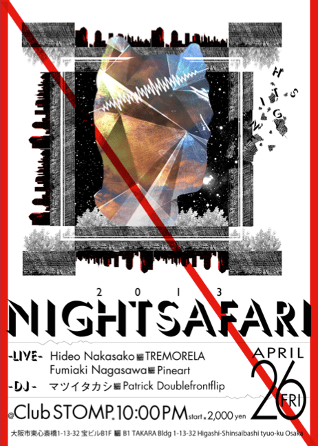 2013-04-202021-02-22 ttetc Night Safari @Club STOMP 2013.04.26 Liveで出演します。Night Safari2013.04.26 fri@Club STOMP22:00~ 2000yen w/1D [Live] Hideo Nakasako TREMORELA Fumiaki Nagasawa Pineart[DJ] マツイタカシPatrick Doublefrontflip いいね 読み込み中… 関連
