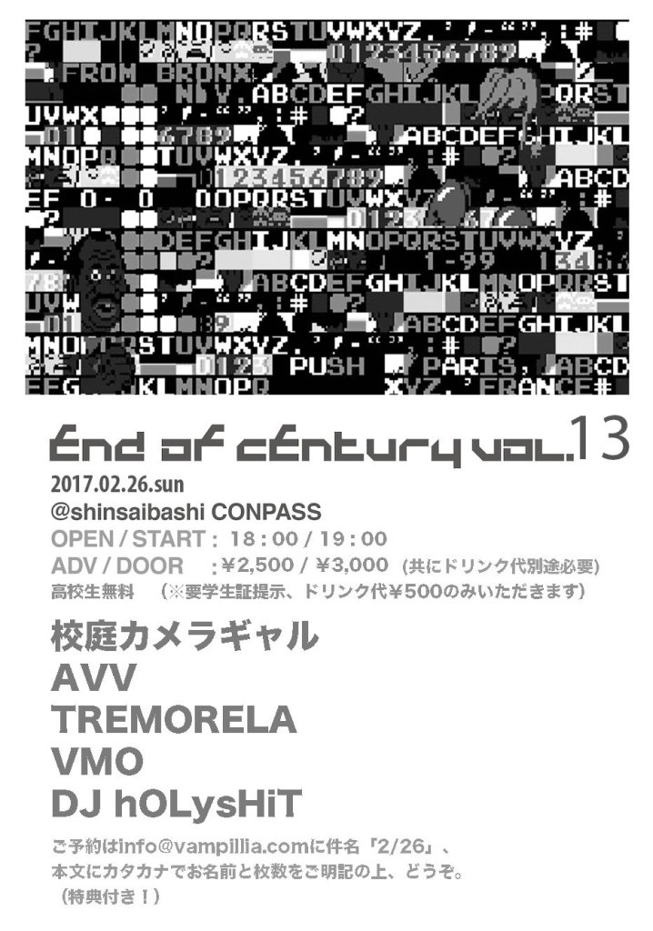 2017-02-052021-02-21 ttetc 世紀末其の十三 @鰻谷CONPASS 2017.2.26 LIVEで出演します。 〈世紀末其の十三〉 2017.2.26 SUN 大阪 東心斎橋CONPASS 前2,500円 当3,000円 +1d 高校生無料 ※要学生証 OPEN/START 18:00/19:00 出演:校庭カメラギャル/AVV/TREMORELA/VMO/DJ hOLysHit いいね 読み込み中… 関連